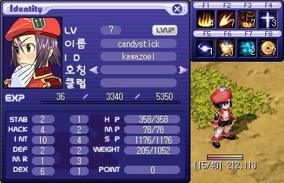 というかんじで、KRのチームに適当に加わりつつレベル7に。INTが10になり、さっさとシャープナークエストをやってそれを売っぱらい、Lv6盾を買ってさっそくポイズンゼリッピにリベンジ。被ダメ自体は1から3ぐらいまでに抑えられたので倒せないことはなくなりました。INTもあがってるのでFBの与ダメも高くなりましたし、FBがLv7になって4HITになりましたし。が、それでもまだ火力的には厳しいものがあるので、適当に金をためて魔法攻撃力1のティアラから魔法攻撃力2のミニクラウンに鞍替え。ってことで、現在のステータスはこんな感じ。
