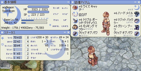 ってことで、ノビ時代は壁でサクッと過ごし(某Fenrir有名騎士の別キャラのBSの銘の入ったマインゴーシュでガシガシと)、剣士に転職してからはひたすらソロ。しかも、とりあえずSTRが素で70になるまでは全振り。