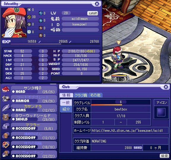 で、とりあえずクラブ結成したのはいいんですが、3月入って2週間も集中講義があるせいで全然クラブ上位層に追いつきません。今日現在メンバーが17人いて、レベルが上から11番目のクラブマスター。逆にいえばレベル高いクラブメンバーが私がこの先使う武器を狩ってきて貸してくれているのである意味資金的に非常に楽な暮らしをしてたりします。