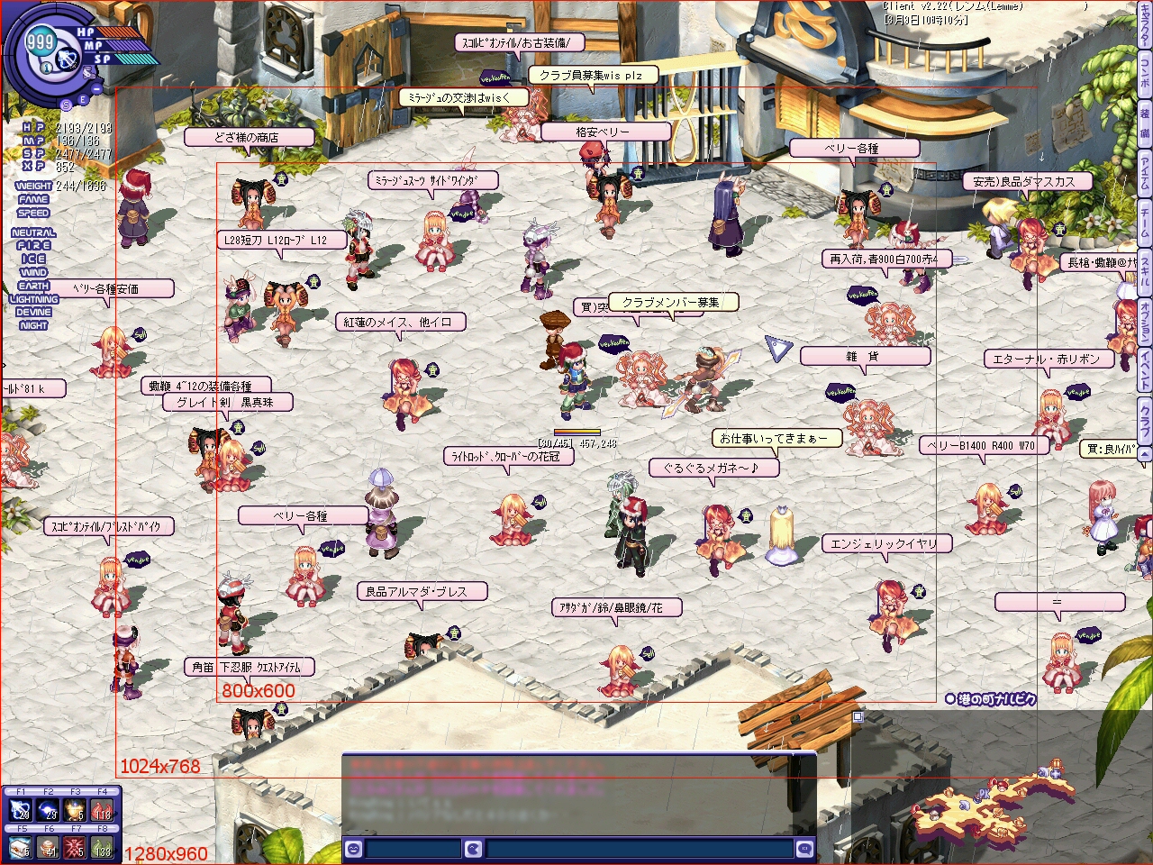 TalesWeaverのクライアントでは、どんな解像度だろうと縦の表示セル数を固定してゲーム解像度によって視野の大きさが変わらないようになっているRagnarokOnlineクライアントとは違い(といっても、レジストリをいじって横に引き延ばしたり、クライアントバイナリorクライアントメモリをいじってズーム制限を解除したりはできるようですね)、ゲーム解像度を引き延ばすことでそのまま視野が広がる仕組みになっています。