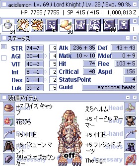 ってことで、とりあえず村正振ってグロリアもらってるのに呪われるのは忍びないというか、オレがいろいろと面倒なのであまってたポイントをAGIとLUKに振り分けました。AGI30にして、LUKは村正で呪われないようにしたらちょうどポイントなくなったんですけど。