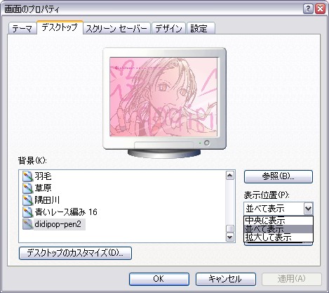 よく壁紙をダウンロードしてくると、XGA(1024x768)とかしかなくて、自分のSXGA(1280x1024)だと縦横比があわないって人、いますよね。で、これをそのままWindowsの壁紙機能で「拡大して表示」(画面解像度にフィッティングする表示)とかやると、なんか縦方向が引き延ばされちゃってきもちわるい。
