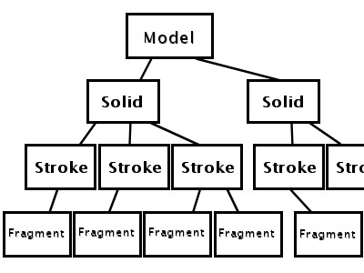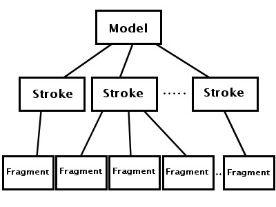 で、オレがやってるのはそのコア技術の実装…ではなくて、その理論によって出された曲線とかを管理して実際のアプリケーションとの橋渡しをするライブラリをつくってるみたいな雰囲気なわけです。ここで必要とされるデータ構造っていうのは、おおざっぱにいうと、ユーザの一筆分のデータを保持するStrokeっていうのと、その一筆の中の一連の描画の流れから描画の区切りを検出してその区切りごとに分けたFragmentってやつなんですよ。ほら、三角形とかは、直線3本っていうFragmentから1つのStrokeを構成してる、みたいな感じね。んでこれを管理するModelがあるので、これをそれっぽく表すと、
