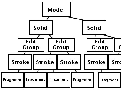 明らかにオレの見通しが甘かったのがバレバレです。ここまで木構造がでかくなると思ってませんでした。こういう時のソリューションは、おとなしく木のパーツを構成するNodeクラスを定義して、Nodeクラスで子Nodeを管理するようにする。んで、Model、Solid、EditGroup、Stroke、FragmentはNodeから派生すれば、木構造の管理コードはすべてNodeに入っているのでそれを意識せずそれぞれの振る舞いを定義できる、という風にすればいいわけですね。