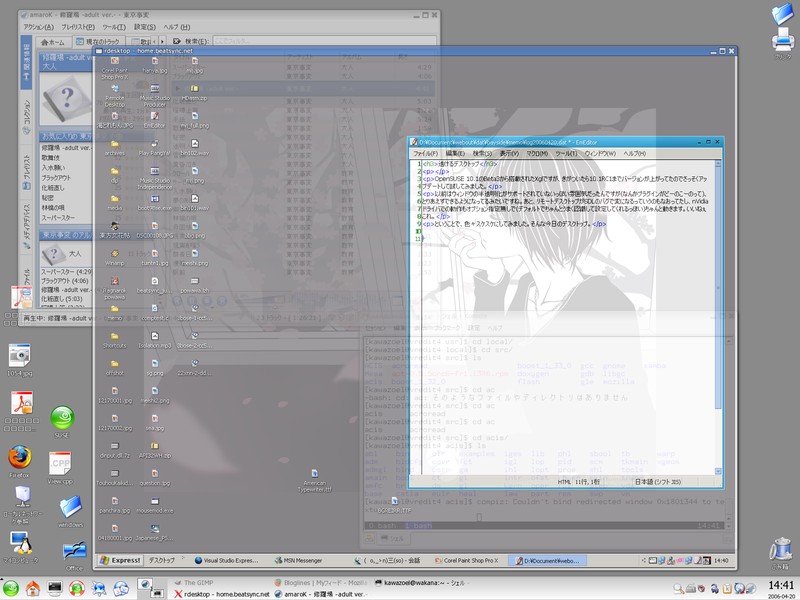 以前はウィンドウの半透明化がサポートされていないっぽい雰囲気だったんですが(なんかプラグインがどーのこーのって)、とりあえずできるようになってるみたいですね。あと、リモートデスクトップがSDLのバグで変になるっていうのもなおってたし、nVidiaドライバでの動作もオプション指定無しで(デフォルトでちゃんとうまく認識して設定してくれるっぽい)ちゃんと動きます。いいねぇこれ。
