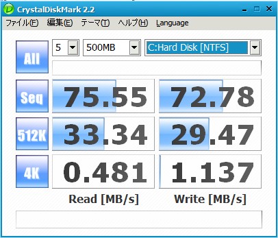 具体的にCrystalDiskMarkの結果を貼っておくとこんな感じです。