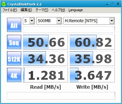 具体的にいうと、いまの普通のHDDはシーケンシャルでRead/Writeすれば70MB/sぐらいでる(去年買ったHDDをCrystalDiskMark 2.2で500MBほどやらせたらそんな感じだった)らしいんです。これをビットに換算すると560Mbpsです。てことは、ネットワークが100Mbpsだと思いっきりネットワークがボトルネックになるわけですよ。いやまぁそんなにスピードを求めないって? そんなこと言わないで。