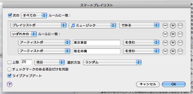 が、こまったことにアーティスト名が東京事変or椎名林檎でスマートプレイリストを作っているところに「プレイリストがミュージックである」を追加するとOR条件で追加されてしまってそのプレイリストにライブラリの全曲が追加されてしまうという罠にはまりました。ああ、困った困った(棒読み)。